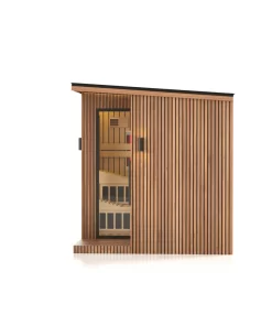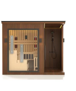 The outdoor combination sauna includes key elements for complete therapy, such as high-quality heating elements, digital function controllers, ergonomic seats, premium materials and beautiful lighting. In addition to top-notch therapy, the outdoor sauna also allows you to truly connect with nature and, with a thoughtful layout, also a beautiful view.